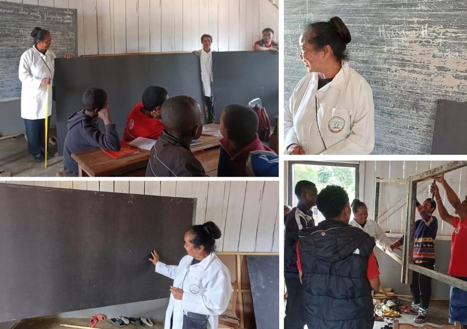 En plus des fournitures pour les élèves et les enseignants – adaptés à chaque niveau – nos avons aussi parfois apporté du matériel, comme des ardoises géantes pour le travail de groupe ou carrément un ensemble de tableaux pour une classe… Tableaux réalisés avec des panneaux d’Isorel renforcés avec des tasseaux et peints à l’ardoisine dans les ateliers de Dominique qui est vraiment un pilier de l’association ! Voyez l’avant/après, la directrice était aux anges !